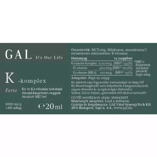 Termékünk a megfelelő felszívódás és stabilitás biztosítása érdekében RSPO-minősítésű (fenntartható gazdaságból származó, „orangután-barát”) pálma- és kókuszolajból nyert MCT-olajban oldva tartalmazza hatóanyagait természetes formájukban, azaz K1-vitamint és a K2-vitamin bioaktív MK-7-es szója allergént sem tartalmazó változatát. (Egyes termékek a K2 MK-7-nek a nem természetes, kevésbé hatásos „cisz-” formáját is tartalmazzák, a GAL K-komplex Forte csak a hatásos, természetes „transz-” formáját.)
